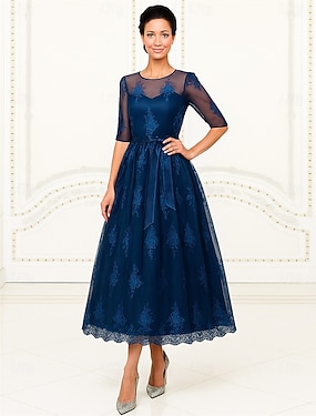 A-lijn Thee Lengte Feestjurk Cocktailjurk Bruiloft Gast Jurk Moeder van de Bruid Jurk 3/4 Lengte Mouw Crew Neck Elegante Vintage Formele Kant met Kant