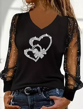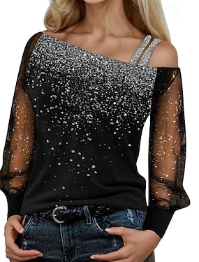 Dames Paillet Glinsterend Feesten Schitteren Lapwerk Netstof Effen Modieus Modern Casual Lange mouw Strakke ronde hals Normale tops Dagelijks Weekend blauw Zwart Wijn Herfst Winter