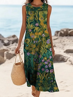 Dames Halflange jurk Imitatie katoenlinnen Hemdjurk Zonnejurk Casual jurk Vintage Dagelijks Buiten Vakantie Normale pasvorm Bloemig Mouwloos Strakke ronde hals Oranje Zomer Lente