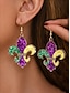 Oorbellen voor dames van imitatieleer met driekleurige fleur-de-lis, in levendig paars, groen en geel, met een sprankelend ontwerp, perfect voor de carnavalsvieringen.