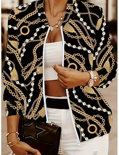 Dames Blazer Comfortabel Ademend Knop Afdrukken Modieus Casual Geometrisch Formeel Kantoor Straat Casual Dubbele rij knopen Normaal Ingesneden revers Normale pasvorm Lange mouw bovenkleding Zwart