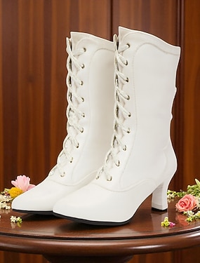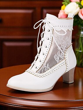 Witte bruidslaarzen voor dames – veterschoenen voor bruiloften met hart- en parelversiering, dikke hak voor vintage-geïnspireerde bruiden