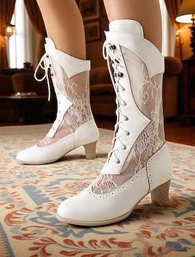 Victoriaanse gothic veterlaarzen voor dames met mesh – Edwardiaanse stijl enkellaarsjes met middelhoge hak uit de jaren 1900 en bloemenkant voor kostuumfeesten, podiumoptredens en retro cosplay