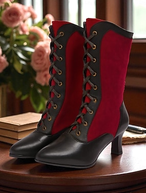 Vintage Victoriaanse veterlaarzen voor dames - rode en zwarte gothic steampunk laarzen met hak voor cosplay, kostuums en kerstgelegenheden