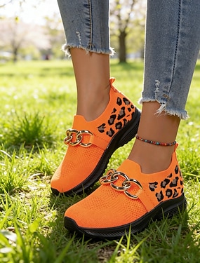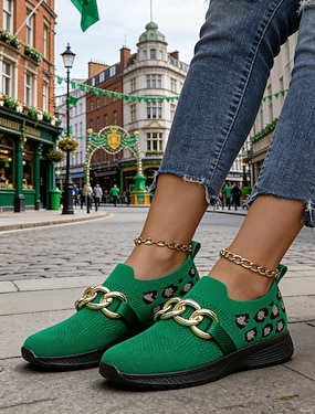 Groene gebreide sneakers voor dames met luipaardprint voor St. Patrick's Day – modieus kettingdetail, comfortabel en trendy, perfect voor parades en informele festiviteiten.