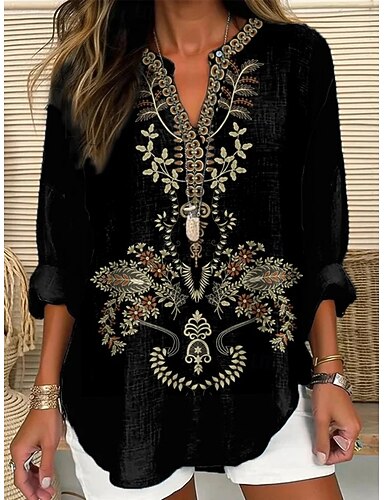 Dames Blouse Linnenachtig Ademend Lichtgewicht Graphic Geometrisch Vintage Tropisch Hawaïaans Lange Mouw V-Hals Reguliere Tops Dagelijks Vakantie Strandoutfit Print Zwart Blauw Kameel Groen Zomer