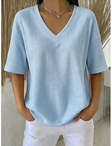 Dames Wafel T-shirt T-shirts Wafelgebreide tops Stijlvol Klassiek Korte mouw V-hals Normale tops Casual Dagelijks Uitgaan blauw Wit Blozend Roze Oranje Zomer Lente
