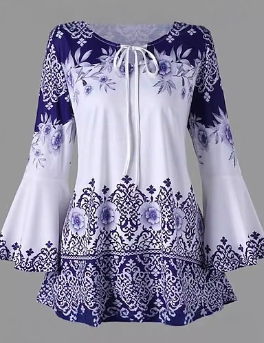 Dames Blouse Grafisch Vintage Dagelijks Stijlvol Lange mouw Bel Strakke ronde hals Normale tops Dagelijks Feestdagen Uitgaan Afdrukken blauw Zwart Zomer Lente