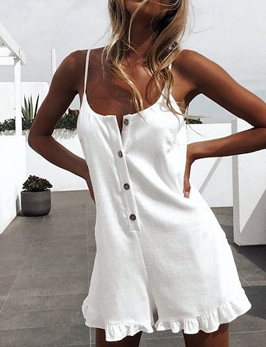 Dames jumpsuit, normale streetwear, effen kleur, mouwloos, U-hals, ruches, knoopjes, imitatie katoen/linnen, geschikt voor dagelijks gebruik, normale pasvorm, zwart, wit, rood, zomer