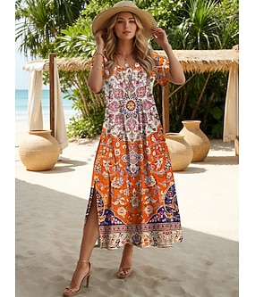 Dames Halflange jurk Zonnejurk A lijn jurk Vakantie Casual Boho Strand Feest Feestdagen Ruim Passend Bloemig Grafisch Lange mouw V-hals Grijs-Groen Stoffig blauw Bruin Zomer Lente Herfst