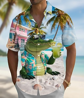 Voor heren Tekenfilm Krokodil Nijlpaard Hawaiiaans overhemd Overhemd met knopen Aloha-shirt Korte mouw Grappig Vakantie Strand Kleding Zomer Lente Strijkijzer 3D-afdrukken shirts met kraag blauw