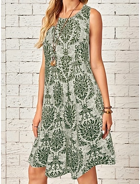 Dames Knielengte jurk Imitatie katoenlinnen Hemdjurk Zonnejurk Bloemetjesjurk Modieus Modern Dagelijks Buiten Feestdagen Normale pasvorm Bloemig Mouwloos Strakke ronde hals blauw Groen Zomer Lente
