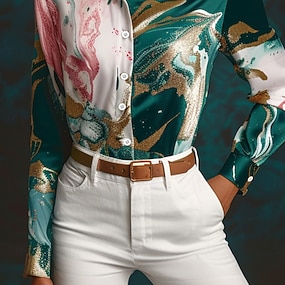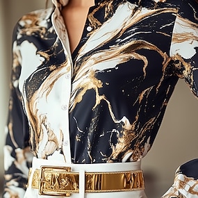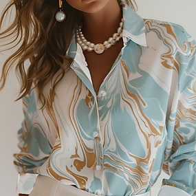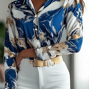 Dames Shirt Lange Mouwen Button Down Blouse Marmer Print Werk Elegant Stijlvolle Business Blauw Zomer Herfst