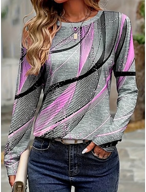 Dames T-shirt Lange Mouw Ronde Hals Lange Mouw Tuniek Grafisch Geometrisch Stijlvol Casual Trendy Reguliere Tops Dagelijks Weekend Print Roze Blauw Herfst Voorherfst