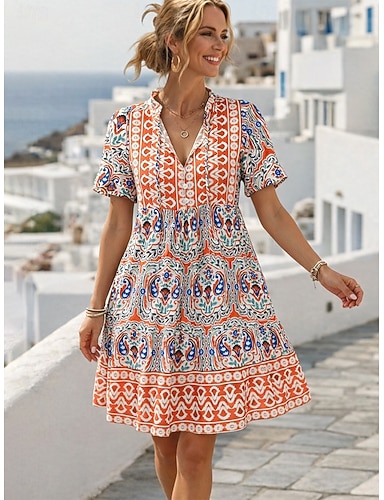 Dames Knielengte jurk Boho-jurk Shirtjurk Elegant Bohemen Etnisch Strand Feestdagen Ruim Passend Grafisch Geometrisch Korte mouw Opstaand blauw Blozend Roze Oranje Zomer Lente
