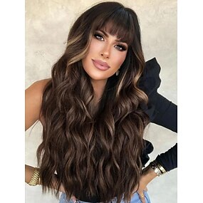 Bruine Pruik met Pony voor Vrouwen Lange Golvende Haar Pruik Bruin Gehighlight Pruik Krullend Golvend Synthetische Pruiken voor Meisjes Dagelijks Feest Gebruik Halloween Pruiken