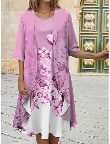 Woman's Twee Delige Jurksets Midi Jurk met Jas Elegante A-lijn Jurk Halve Mouw Casual Bloemenprint Ronde Hals Date Roze Blauw Paars Regular Fit