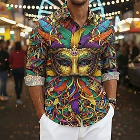 Carnaval Voor heren Grafisch Masker met veren Overhemd Button-down overhemd Strand hemd Lange mouw Hawaii Casual Comfortabel Vakantie Feestdagen Mardi gras Zomer Lente Strijkijzer Opdrukken Goud