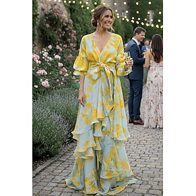 A-Lijn Avondjurk Elegante Jurk Formeel Bruiloft Vloerlengte Lange Mouwen V Hals Chiffon met Bloemenprint Bruiloft Gast Jurk