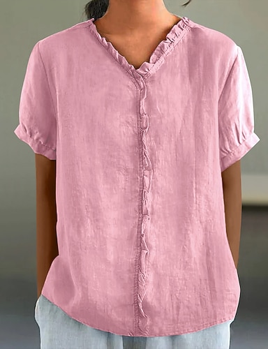 Dames Blouse Imitatie katoenlinnen Geplooid Effen Kleur Elegant Casual Korte mouw V-hals Normale tops Dagelijks Feestdagen Zwart Wit Blozend Roze Paars Groen Zomer