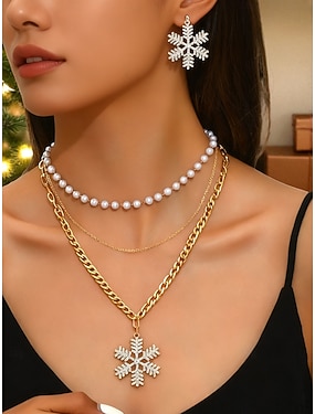 Set van sneeuwvlokketting en oorbellen voor dames, gelaagde sieraden van goud en parel voor kerstfeestjes en vakantiecadeaus &winteroutfits