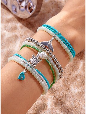 Armbandset met schildpad- en walvisstaartkralen voor dames. Sieraden geïnspireerd op de oceaan met parel-, turquoise- en zilveren accenten, perfect voor strand, zomer en een bohemian-stijl.