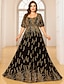 Zwart Tafel Moeder van de Bruid A-Lijn Avondjurk Elegante Jurk Formele Bruiloft Gast Vloerlengte Lange Mouw Blousekraag Satijn met Split Borduursels Appliqués