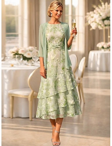 A-lijn Jurken Tot de enkel Over de knie Bruiloft gast jurk Moeder van de bruid jurk Korte mouw Strakke ronde hals V-hals Elegant Pastel Formeel Bruiloft gast Semi formeel Kant met 3D-bloemen