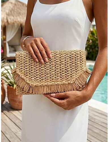 Dames clutch van riet in bohemian stijl, veelkleurige handtas met kwastjes, lichtgewicht en stijlvolle tas voor strandvakanties, strandfeesten en dagelijks gebruik.