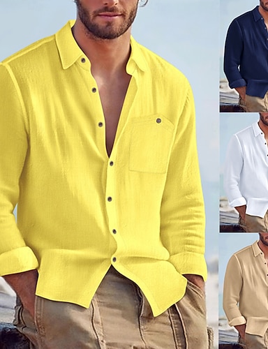 Voor heren Overhemd Linnen overhemd Zomer overhemd Strand Kleding Overhemd met knopen Effen Vakantie Straat Zwart Wit Geel Marineblauw Lange mouw Strijkijzer Zomer Lente Kleding Zak