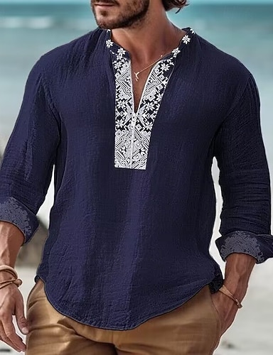 Voor heren linnen overhemd Normaal shirt Strand hemd Effen Hawaii Feestdagen Grijs Lange mouw Henley Lente zomer Kleding