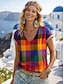Dames T-shirt Afdrukken Grafisch Ruitjes Bohemen Vintage Casual Korte mouw V-hals Normale tops Dagelijks Regenboog Zomer Lente