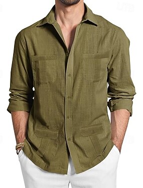 Voor heren Overhemd linnen overhemd Normaal shirt Overhemd met knopen Katoenen shirt Guayabera Effen Vakantie Hawaii Zwart Wit Groen Abrikoos Lange mouw Revers Lente Herfst Kleding Voorvak