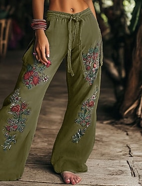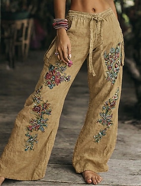 Dames Breed Been Broeken Lichtgewicht Casual Volledige lengte Medium taille Bloemig Grafisch Opdrukken Ademend Comfortabel Inelastisch Huis Casual / Dagelijks Bruin Zomer Lente Normale pasvorm