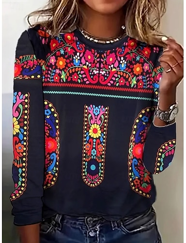 Dames T-shirt Afdrukken Bloemig Grafisch Tribal Vintage Modieus Stijlvol Lange mouw Strakke ronde hals Ronde hals Normale tops Dagelijks Weekend Rood Lente Herfst Winter