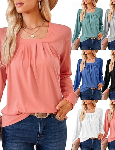 Dames Blouse Met ruches Effen Kleur Dagelijks Stijlvol Casual Lange mouw Vierkante hals Normale tops Dagelijks blauw Zwart Wit Blozend Roze Grijs Lente Herfst Winter