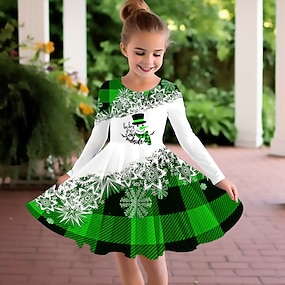Meisjes 3D Ruitjes Sneeuwvlok Sneeuwvlokjurk Jurk met ruches Lange mouw 3D-afdrukken Herfst Winter Vakantie Sport & Outdoor Dagelijks leuke Style Casual Mooi Kinderen 3-12 jaar Casual jurk A lijn