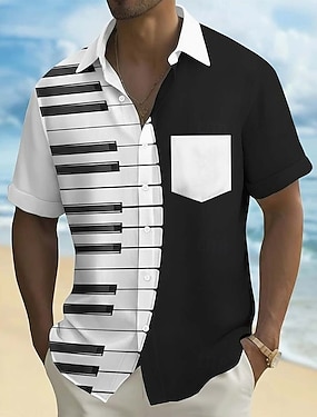 Voor heren Piano Muziek noten Overhemd Zomer overhemd Overhemd met knopen Korte mouw Mode-casual Dagelijks muziekfestival Zomer Lente Strijkijzer 3D-afdrukken shirts met kraag Voorste zak blauw Zwart