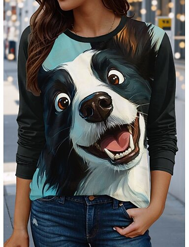 Dames T-shirt Crew Neck Lange Mouw Tuniek Hond Casual Reguliere Tops Dagelijkse Print Zwart Lente Herfst