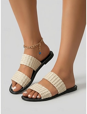 Crèmekleurige dames slippers met dubbele bandjes - bohemian platte strandslippers met textuurstof voor luxe resortvakanties en ontspanning in hotels. &strandvakanties