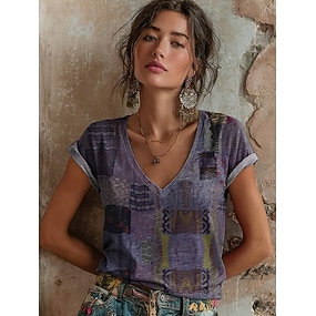 Dames T-shirt Afdrukken Grafisch Geometrisch graffiti Bohemen Vintage Casual Korte mouw V-hals Normale tops Dagelijks blauw Zwart Paars Rode roos Zomer Lente
