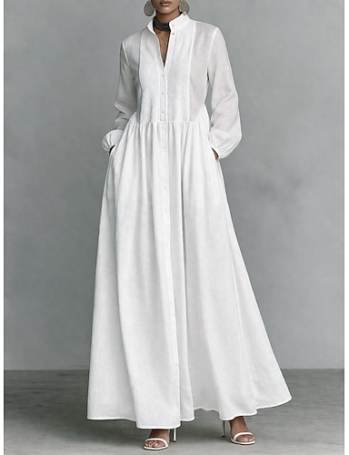 Dames Maxi-jurk Imitatie katoenlinnen Shirtjurk Witte jurk Zwarte jurk Modieus Dagelijks Klassiek Dagelijks Buiten Vakantie Ruim Passend Effen Lange mouw Opstaand blauw Zwart Wit Geel Herfst