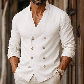 Voor heren Overhemd linnen overhemd Katoenen linnen overhemd Wit katoenen overhemd Zomer overhemd Strand hemd Effen Hawaii Feestdagen Wit Lange mouw V-hals Lente & Herfst Kleding