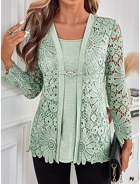 Dames Tuniek Elegant Lange mouw Vierkante hals Normale tops Vakantie Valentijnsdag Dagelijks Kant Knop Vetergat Lichtgroen Lente Herfst