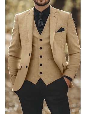 Heren Linnen pakken Strand bruiloft Bruiloft Beige Lente, Herfst, Winter, Zomer Pak Effen Getailleerd 3-delige set Enkele rij knopen met één knoop