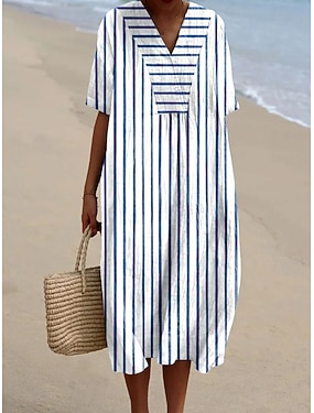 Dames Halflange jurk Zonnejurk A lijn jurk Vakantie Casual Strandstijl Feest Uitgaan Strand Ruim Passend Grafisch Geometrisch Streep Halve mouw V-hals Geel blauw Donkergrijs Zomer Lente