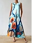 Dames Midi Jurk Linnenachtig Zomerjurk Vakantie Casual Boho Uitgaande Bloemen Grafisch Mouwloos Ronde Hals Wit Blauw Oranje Groen Zomer Lente