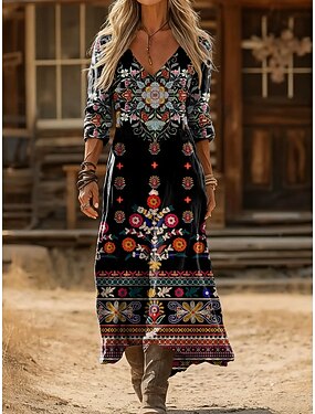Vrouwen Maxi Jurk Boho Sheath Jurk Feest Casual Dagelijkse Date Uitgaan Reguliere Pasvorm Grafisch Geometrisch Paisley Lange Mouw V-hals Blauw Zwart Lichtbruin Paars Lente Herfst Winter