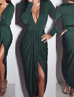Dames Halflange jurk Satijnen Jurk Bodycon Jurk met ruches Modieus Modern Vakantie Club Weekend Normale pasvorm Effen Lange mouw V-hals Zwart Groen Khaki Zomer