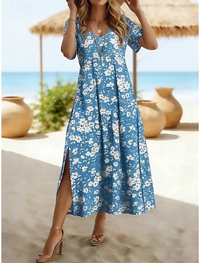 Dames Maxi-jurk A lijn jurk Zomerjurk Vakantie Casual Strand Normale pasvorm Bloemig Grafisch Korte mouw V-hals blauw Donkerblauw Zomer Lente